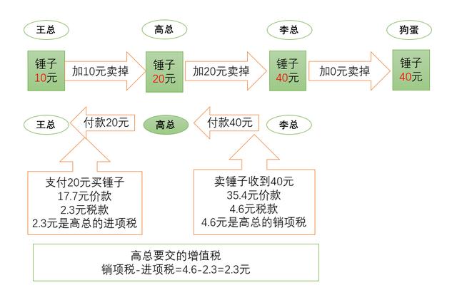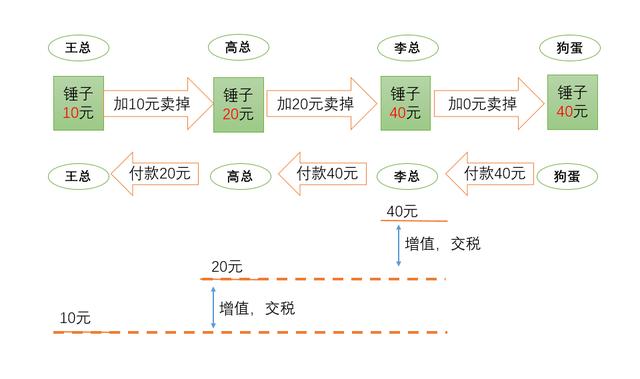 王总有一个锤子。他花10块钱买来的这个锤子。王总把这个锤子20元卖给了高总,这一卖王总赚了10元(增值10元);高总又把这个锤子40元卖给李总,这一卖高总赚了20元(增值20元);李总花40元买了一个锤子,然后转手40元卖给狗蛋,没有加价,因为李总本身就是个锤子,专干些吃力不讨好的事。