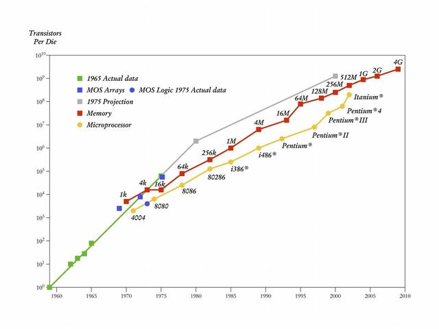 摩尔定律(Moore's Law)是指英特尔创始人之一戈登·摩尔(Gordon Moore)于1965年提出的一个观察性预言和指导性原则。摩尔定律描述了集成电路上可容纳的晶体管数量每隔一段时间会翻倍,而成本和功耗则相应减少。以下是摩尔定律的一些详细信息: