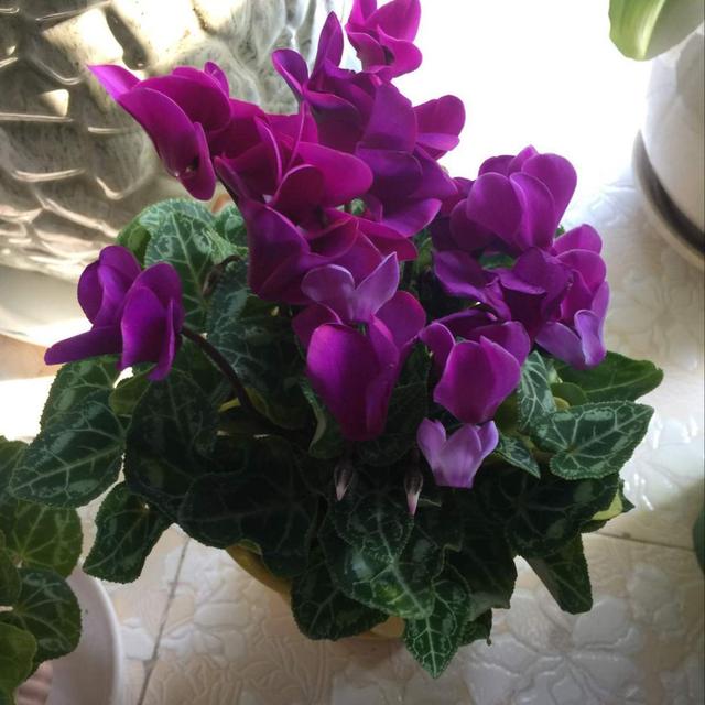 仙客来开花颜色非常鲜艳,茎较长,寓意紫气东来。虽然仙客来比较耐旱,浇水不宜过多,但还是要勤浇水,少量多次,保持土壤湿润。