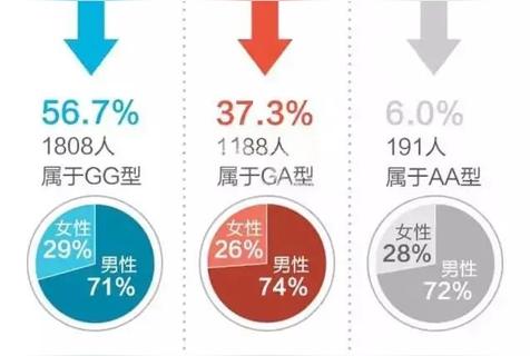 浙江医院曾做过一项4000例的酒精基因方面研究,在5年时间里,浙江医院对不同人群不同基因的近4000人(留有有效联系方式的样本人群,男女比例为72%:28%)进行酒精基因检测分析,其中,90%以上是杭州人,主要以40~60岁这个年龄段的人为主,占65%以上,这些人群中有56.7%的被检测者属于GG型,37.3%属于GA型,另有6%属于“一杯倒”,此外,3种类型中,男性比例均占7成以上。
