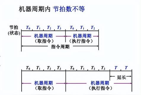 CPU从主存取出执行的时间为指令周期,不同指令指令周期不同。指令周期常用若干机器周期来表示,一个机器周期又包含若干时钟周期(即节拍或者T周期,是CPU操作的醉基本单位)。每个指令周期内的机器周期可以不等,每个机器周期的节拍数也可以不等。机器周期又分为定长的机器周期和不定长的机器周期。如图
