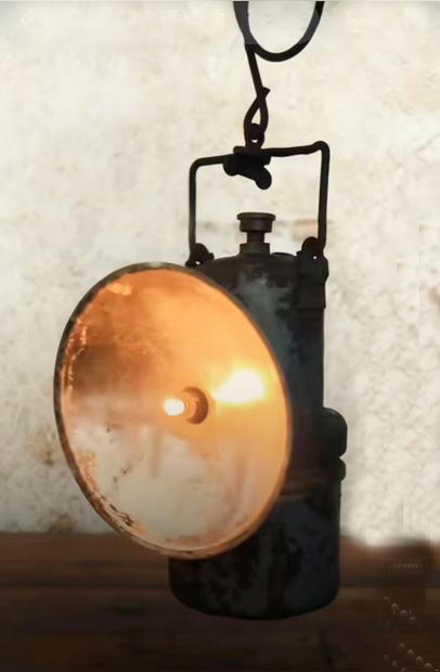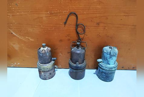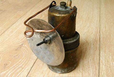 一种将电石(碳化钙)燃烧后照明的用具。其原理就是利用电石与水反应生成乙炔,点燃乙炔燃烧发光。灯身用铜、铁铸造,分为上下两部分,其中电石放在底部,水放在顶部,上下腔室用一根气管连通,使用时拧开阀门,让上部的水滴到下部的电石上,然后在底部反应形成易燃的乙炔气体,气体沿着另一根管道来到灯头,在这里利用火花将其点燃,即可发光照明。火苗的大小,则由顶部的阀门通过对出水量的多少进行控制。