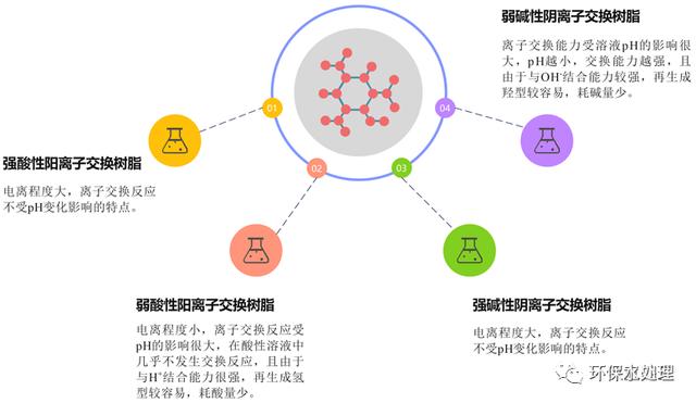 按离子交换树脂活性基团电离程度及其与溶液中阴、阳离子交换情况,分为: