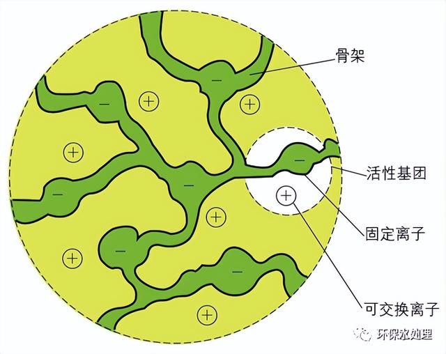 梁世中在其主编的《生物工程设备(第二版)》中,对“离子交换树脂”定义如下:离子交换树脂是一种具有网状立体结构、且不溶于酸、碱和有机溶剂的固体高分子化合物。离子交换树脂的单元结构由两部分组成。一部分是不可移动且具有立体结构的网络骨架,另一部分是可在网络骨架和溶液间自由迁移的活性离子。