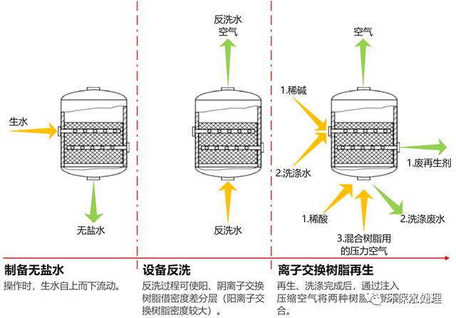 下面简要介绍一下混合床交换罐的工作原理。混合床交换罐主要用于制备无盐水,罐内同时装填了阳、阴两种离子交换树脂,脱盐较完全。在制备无盐水时,可将水中的阳、阴离子同时除去,而从树脂上交换出来的 H+ 和 OH– 结合成水,可避免由于出水 pH 的变化而影响产品的质量。混合床交换罐工作过程可分为三个阶段: