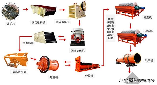颚式破碎机用于对大块磷矿的初破碎,破碎后的磷矿粒度变小,满足下一步施工要求,圆锥破碎机负责磷矿中细碎,大多数时候磷矿石经过颚破处理后能直接进入球磨机时,可不需要配置圆锥破。另外,在破碎阶段应搭配振动筛来区别合格与不合格的矿石。