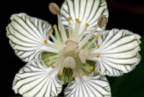 花单生顶端,白色至浅黄色,形似梅花;萼五片,椭圆形;花五瓣,平展,卵状圆形,先端圆;雄蕊五枚,与花瓣互生;退化雄蕊中上部丝裂,裂片先端有头状腺体;心皮四枚,合生,子房上位,卵形;花柱极短,顶端四裂。蒴果卵圆形,上部亦有四裂,种子多数。花期7-8月,果期8-9月。