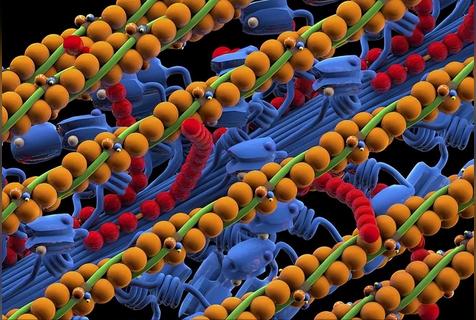 肌球蛋白作为细胞骨架的分子马达,是一种多功能蛋白质,其主要功能是为肌肉收缩提供力。纤丝滑动学说(sliding filament theory)认为肌肉收缩是由于肌动蛋白细丝与肌球蛋白丝相互滑动的结果。在肌肉收缩过程中,粗丝和细丝本身的长度都不发生改变,当纤丝滑动时,肌球蛋白的头部与肌动蛋白的分子发生接触(attachment)、转动(tilting),最后脱离(detachment)的连续过程,其结果使细丝进行相对的滑动。