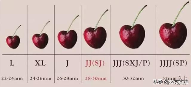 车厘子根据直径分为划分为J(单勾)、JJ(双勾)、J(3勾)和JJJ(4勾)四个不同的等级,其中级是指车厘子的直径在26mm-28mm之间;而JJ是指车厘子的直径在28mm-30mm之间。