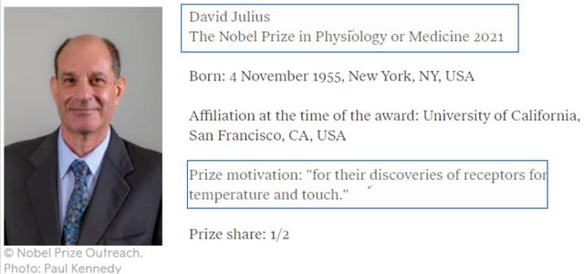 美国科学家David Julius因发现辣椒素受体TRPV1蛋白获得2021年诺贝尔生理学或医学奖