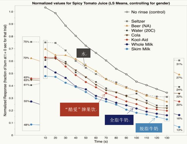 研究者指出,牛奶具有最佳效果,一方面缘于辣椒素亲脂性,可以将辣椒素从受体中分离出来,一方面可能牛奶中的主要蛋白质-酪蛋白(~80%),对辣椒素的溶解或乳化,减少了其与辣椒素受体TRPV1蛋白的结合,从而减轻灼痛感。