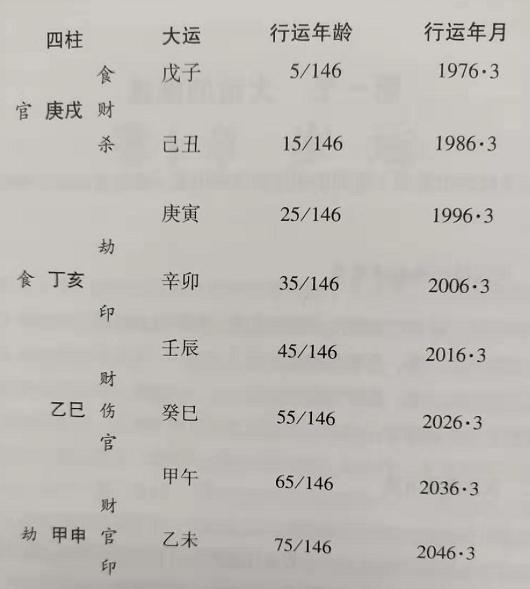 2.以出生之日为起点,顺数到离生日最近的第一个节令,看有多少天。1970年11月初九,20点43分为“大雪”节令,离该命造生日最近,相聚天数为16天,如果精确计算则为16天5小时13分。按3天对应1岁计算,约为5岁起运,如果精确计算则为5岁零4个月26天2小时起大运。一般不必精确到日和时,只需推算出几岁几个月起运就行,接近一个月的算作一个月。即该造起运年龄约为五岁零五个月。
