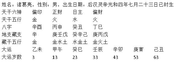 诸葛亮六出祁山的时候,已54岁了,这一年的大运为“己丑”,流年为“甲寅”,己土克制不了命上的大水,却反而生助八字上的金,使八字上的金水愈旺,甲寅皆木,能生火,为命之所喜;但到了秋天,树木凋零,自顾不暇,又怎能生火。故这一年的八月二十八日,是为“癸酉”月“庚辰”日,诸葛亮不幸病死于五丈原,此皆因癸西为水金,庚辰为金水之故。