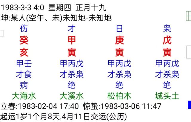 再看年上癸亥一柱是伤食,地支一片财,就要想到食神生财的组合了。那到底是不是“食神生财,富贵自来”,就要看有没有符合上面的使用条件了。第一个四柱只有且仅有庚金生的水,那这个食神就是我们日主所生,第一个条件成立了。第二财星要与我宫有联系,寅木是财在我的坐下又伏吟到了月时。月和时都是门户,都是我与外界联系的一个窗口。古书云:何知其人福,财星当门户。到此,我们就可以大概的知道这个八字是有一定层次的了。