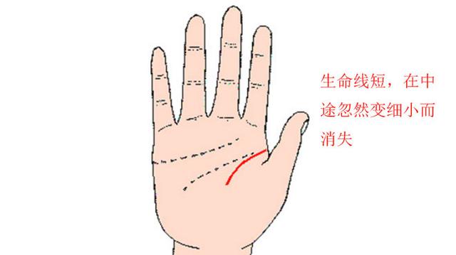 1:手相生命线短,在中途忽然变细小而消失,这说明你的寿命可能会比较短,即表示生命力弱。即使生命线再短,但大拇指不错或智慧线优秀或辅助线的火星线有劲的话,那就可补救生命线的缺点,短的生命线也有微微伸长的可能性要养成良好的生活习惯,多锻炼,增强体质,能够延长寿命