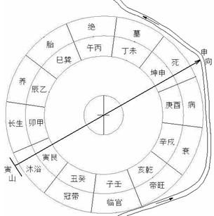 在西北方天盘缝针的壬位有一条小河,从壬子方流来,丁位上流出,为右水到左,属阴水,故逆排十二长生,排为从甲卯起长生,临官来水,墓方出水。卯乃癸水长生之地,此地乘癸水(阴水)之气,地为水局,应立水向,按地支三合,申子辰三合水,壬子、坤申、乙辰都为水向。此例立寅山申向,符合旺方来水、衰墓方出水、背山面水的大吉格局。