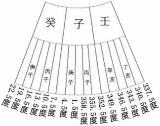 罗盘中有一层叫120龙分金,此分金法即用此盘。例如,下图是壬、子、癸三山的分金线: