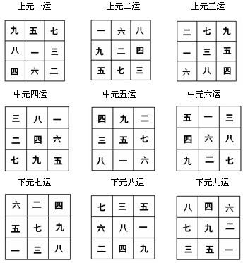 古人将住宅分为九宫,并配置紫白九星,紫白九星随着元运在九宫移行,从而决定着九宫各宫位的旺衰变化。