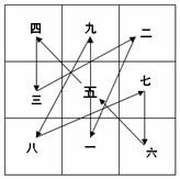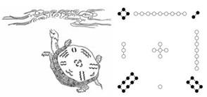 九宫源自传说中的“洛书”, 洛书古称龟书,传说有神龟出于洛水,其甲壳上有图象如下: