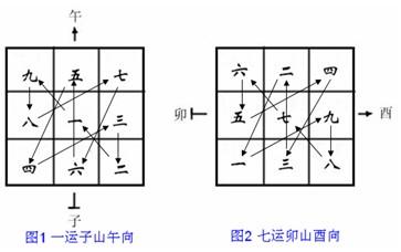 言归正传,下面就说一下地运年限。地运最长的160年,最短的仅20年。地运是如何计算的呢?地运之长短,是以向星飞入中宫经历的运数决定的。比如:在一运立子山午向(下面图1),向星为五黄,在飞星过程中,经过四三二一共四运而入中宫,每运二十年,合八十年。再如在七运立卯山酉向(下面图2),向星为九紫,经过八七共两运而入中宫,每运二十年,合为四十年。