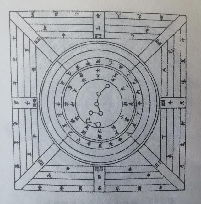 在东汉、六朝时占卜用的二十四分位的六壬盘已有出土实物,而维辰记时的制度在魏晋南北朝的天象记录中是常用的。早期的堪舆书如唐杨益的《青囊奥语》、《天玉经》,卜则巍的《雪心赋》均有关于罗盘的用语。如《天玉经》说:"先天盘上十二支,后天加上干和维,八干四维辅支位,子母公孙同此推。"《青囊奥语》中有许多罗盘的使用方法说明,但语言较隐晦,不易理解。从唐代出土的天文铜镜拓片内容,可推测此时的罗盘已有了较多的内容与层数。湖南出土的一枚唐代天文铜镜,铸造工艺十分精致,自中心镜钮外计有五层,第一层为四灵兽(四象),第二层为十二生肖,第三层为后天八卦,第四层为二十八宿,第五层为字铭