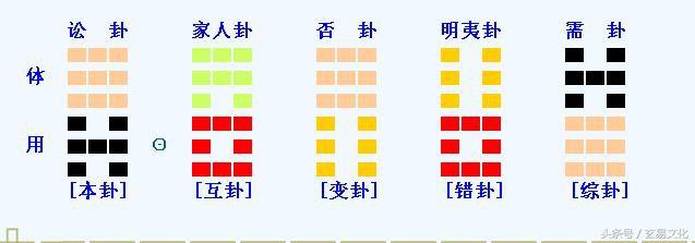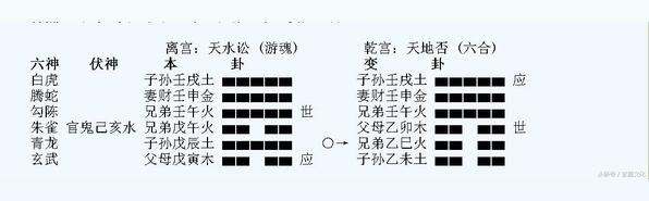 为了加深理解,我们现以时间卦,《讼》变《否》为例,并分别按装上六亲的列出卦象来予以说明: