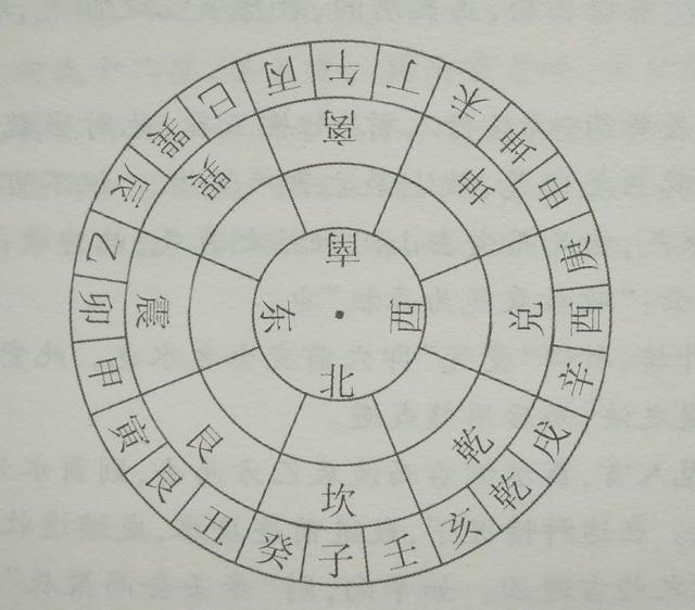 上图所示,内层为后天八卦,震离兑坎四卦,居东南西北四正之位,是木火金水,生旺之正气。乾坤艮巽四卦,居四维之地,补四正之不及。外层为正针之二十四山向,一卦管三山。十二地支配上八天干,再配上乾巽艮坤四维,即成二十四山向。
