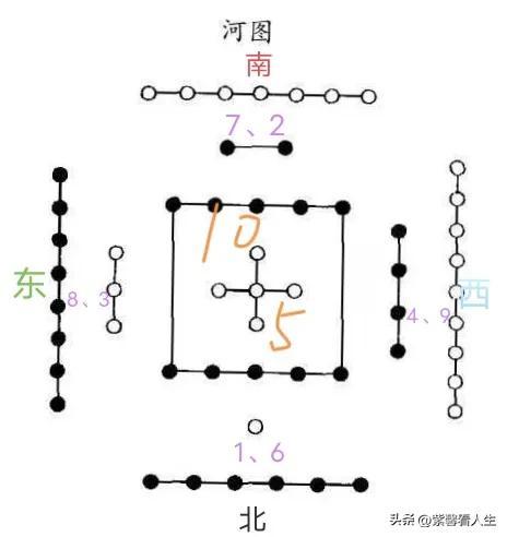 在河图中:上方为南代表火、下方为北代表水、左方为东代表木,右方为西代表金,加上中央代表土,正是五个方位及五种五行的代表。易经是"天地定位″!而圣人画卦据说受河图启发"依则而作″,也就是根据一定规则顺序而画的。