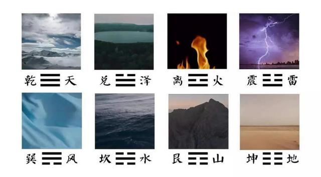 八个经卦,“天、地、水、火、雷、风、山、泽”分别对应乾、坤、坎、离、震、巽、艮、兑。