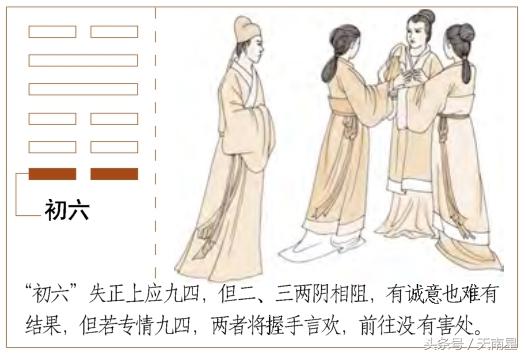【白话】初六,如果对神灵的一片诚心不能始终如一,各种乱子就会发生而凑到一起;众人喧哗呼号,只要彼此握手交流感情,就能化众怒为欢笑;用不着忧虑,前去行事不会遇到灾祸。