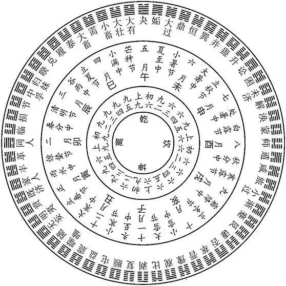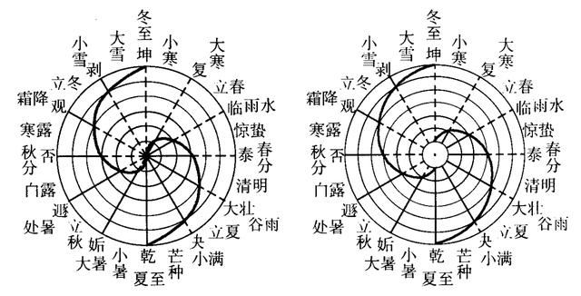 如果我们在“七衡六间图”上的七个同心圆上,画出太阳周年运行的轨迹,得到的就是著名的太极图,把这个太极图按一年十二个月分成十二等分,得到的就是著名的“十二辟卦”。
