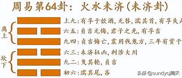 未济卦是《易经》最后一卦,未济卦是还没有渡过河。最后的未济卦表示下一个周期的重新开始,这就是《易经》--周期变化,前一个周期的终点恰好是下一个周期的始点,万事万物都遵循周而复始、变动不居的大规律。