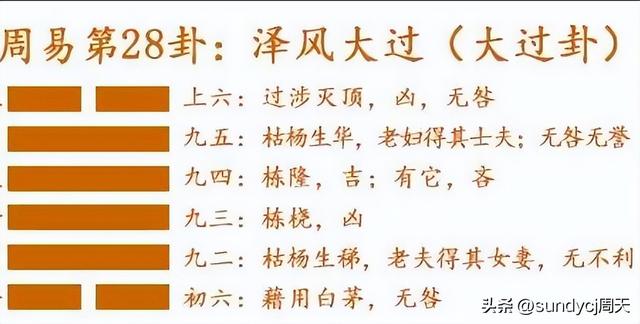 大过简析:处于大过的时候,最为君子,我们有两种做法:第一,进,则独立不惧;第二,退,则遁世无闷。如果从六根爻的爻辞来看,初六爻是“遁世无闷”,愿意给别人当垫子垫在下面,隐退且心甘情愿,居下无争。上六爻则是“独立无惧”,面对最凶险的局面不惧怕,愿意献身改变大过的局面。中间四根爻全是阴爻,基本都讲的是如何改变大过的局面,九二爻和九五爻都做了比喻,九二爻是老夫娶少妻,九五爻是老妇得到“士夫”,从阴阳配合而言,主要讲夫妇之间相亲相爱、互帮互助,就能改变大过的局面;九三爻和九四爻都以栋梁做比喻,一个是栋梁弯曲,一个是栋梁隆起,首先指要自己强大,栋梁才不会弯曲,然后要得到阴柔之人(其他人)的帮助,才能改变大过的局面。