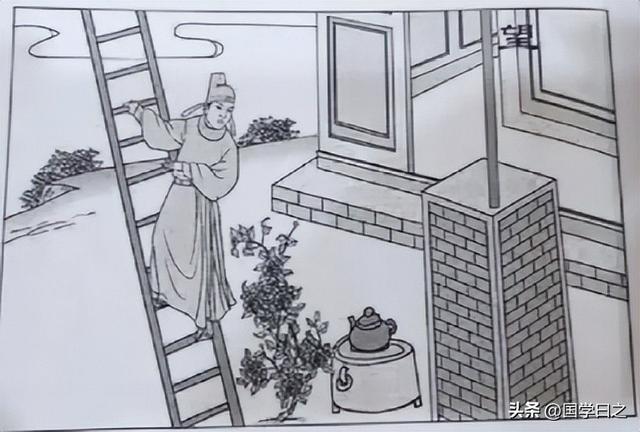 图中,一望竿在堠上,一药炉在地,一官人登梯,一枝花在地上