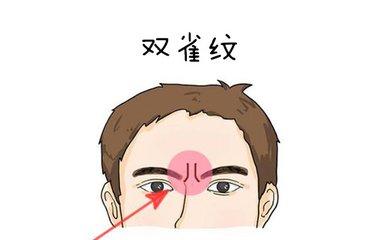 距印堂之间相近的两条纹路为“双雀纹”,有双雀纹的人性格太刚,易出伤害之事,若是两道纹路成八字型。则为八字纹。