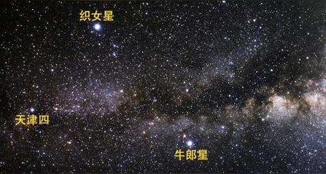 古代传说牛郎织女7月7日在鹊桥相遇。事实上,牛郎织女相距14光年。即使乘坐现代最强大的火箭,几百年后也不会相遇。牛郎星两侧的两颗暗星是牛郎的两个儿子——河鼓一和河鼓三。传说牛郎用扁担挑着两个儿子追织女。