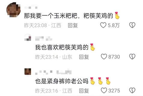 还有个网友看了这个视频后,直接说出了自己找对象的标准,那我要一个玉米粑粑,粑筷芙鸡的。刚开始我还在纳闷,玉米粑粑,我能理解,一米八八吗,好理解。