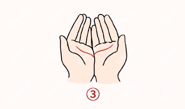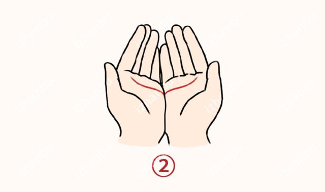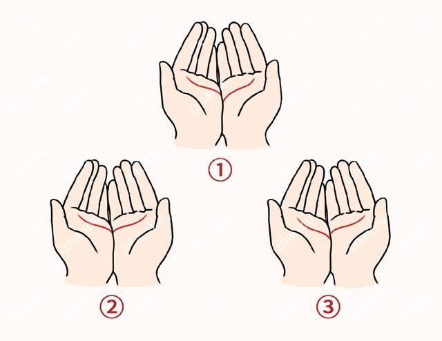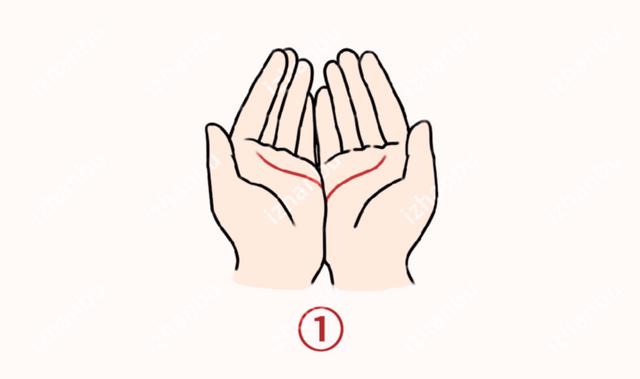 最后,将双手摊开,保持掌心向上的姿势,微微向内弯手掌,同时把小拇指一侧紧紧相贴,然后观察两只手掌感情线的位置高低(如下图▼)确定之后,找到对应的图片,向下翻看答案吧。