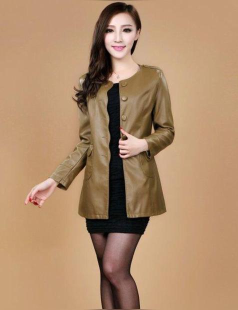 皮外套也适合12-18度的天气穿,特别是这种超薄又时髦的圆领皮外套,简约又有时尚范,门襟有几个大纽扣点缀,提升了造型感,样式是稍微收腰设计,摒弃直筒设计,让你展现修长细腰,内搭针织打底裙,细长身材线条即可彰显,非常的婉约时尚,极具欣赏美。