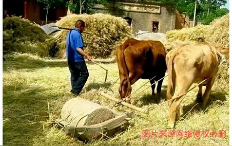 割过的小麦先放成一堆一堆的,然后用架子车拉到场里边,摊开晒干,当时手扶拖拉机都很少,大多用两头牛拉个石磙来回转圈,把麦粒给压下来。