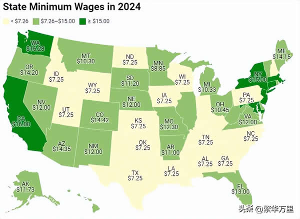我们言归正传,聊聊美国的工资水平。一般来说,欧美各国普遍使用小时计薪的方式。2024年1月,美国陆续出台了各州的最低每小时工资标准。由于各个州的经济发展很不均衡,各个州的标准差异巨大。其中,华盛顿州的每小时最低工资标准最高,达到了16.28美元。其次是加利福尼亚州,每小时最低工资为每小时16美元。