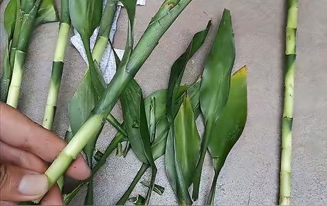 有的朋友在家里水培富贵竹的时候,拿回来的枝条直接水培起来,其实最好是先处理一下,如果枝条太长,可以斜着剪掉下面一部分的枝干,一定是剪成斜面,方便它吸收水分和养分,同时剪掉下面的几片叶子,再放入玻璃瓶里面。