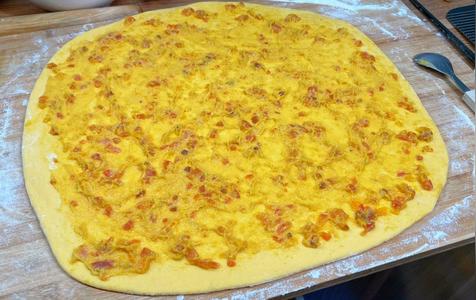 4、红薯泥里面加入少量的干面粉和食用油(这个可以根据自己蒸的红薯水分含量多少来添加,不能太稀了)再将切好的柿子饼丁放进去搅拌均匀,用擀面杖将南瓜面团擀成一张厚薄均匀的大圆饼,把红薯柿子泥均匀地涂抹在面饼上。