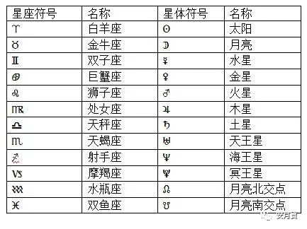 首先,我们先来认识12行星,12星座,12宫位的符号。十二行星(包括南北郊点):太阳,月亮,水星,金星,火星,木星,土星,天王星,海王星,冥王星,南郊点,北郊点。