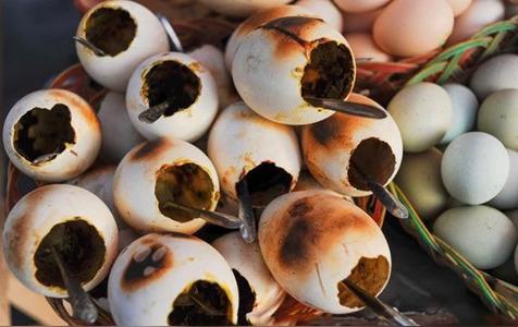《世说新语•忿狷第三十一》有这么一段:“王蓝田性急。尝食鸡子,以箸刺之不得,便大怒,举以掷地。鸡子于地圆转未止,仍下地以屐齿蹍之。又不得。瞋甚,复于地取内口中,啮破即吐之。”这大概可以说明:晋人有可能在吃鸡蛋时是不先剥壳的,应该是只破一小口,用筷子挑着吃。