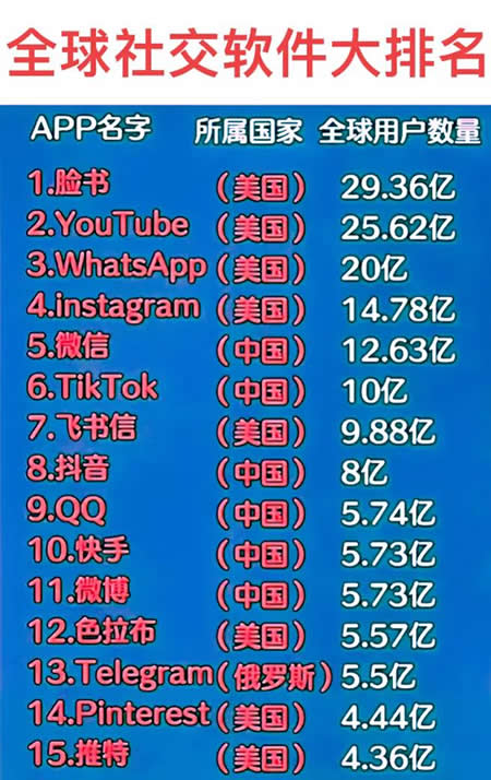 如图所示,美国的社交软件几乎是全球都在用,而我国的社交软件主要是中国人在用。不是我们的社交软件不好用,而是美国推广的软件,全球没有几个国家敢说“不”,正如我们的“TikTok”一样,明明是全球最好的短视频平台,也得到了美国老百姓认可,可是美国就以安全为由拒绝了它。也就是说,我们的社交软件与美国的同时推广至全球,让老百姓自由选择的话,保证美国会完败。