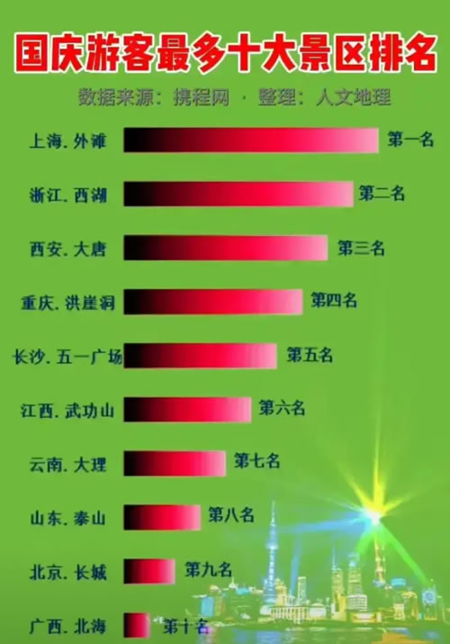 杭州西湖再次上榜,西湖果然是真的很火啊,在国庆各种旅游榜单排名中,几乎都是排在前三甲。浙江杭州西湖,这次排名第二。