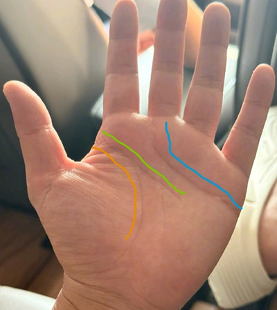 左起掌边纹路碎,小时候身体一般,爱得病。往下延的距离挺长,寿命可以,中间偏下纹路很淡,注意老年痴呆及衍生老年病。