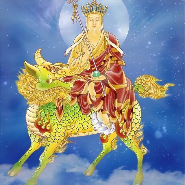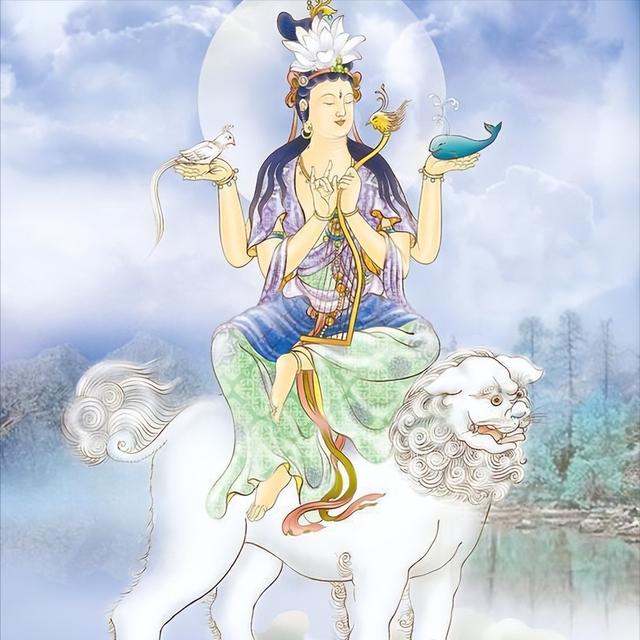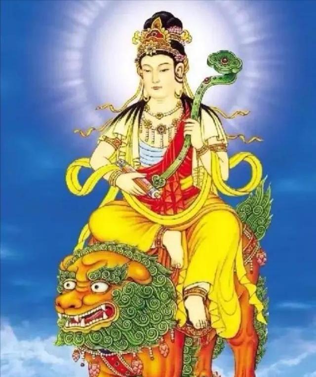 文殊的道场在五台山,他是释迦牟尼的左胁侍,并与释迦牟尼、普贤合称华严三圣,文殊代表了智慧,他骑乘狮子,寓意是狮吼威震魔怨。