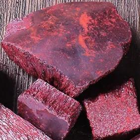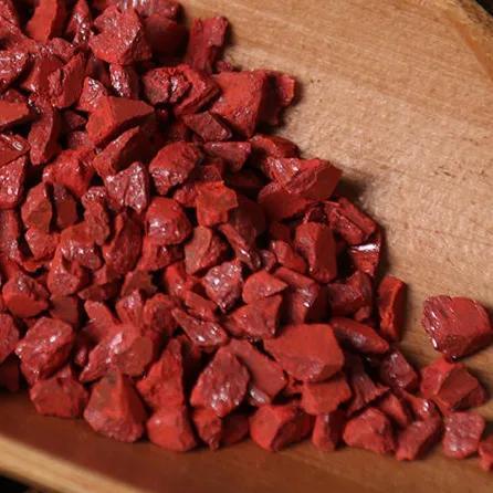 天然朱砂为粒状或块状集合体,呈大小不一的块状或细小颖粒。块状大者表面暗红色,细小的片状或粒状者表面鲜红色,不规则薄片色红鲜艳,光亮如镜,触手不染,具金刚光泽,半透明。
